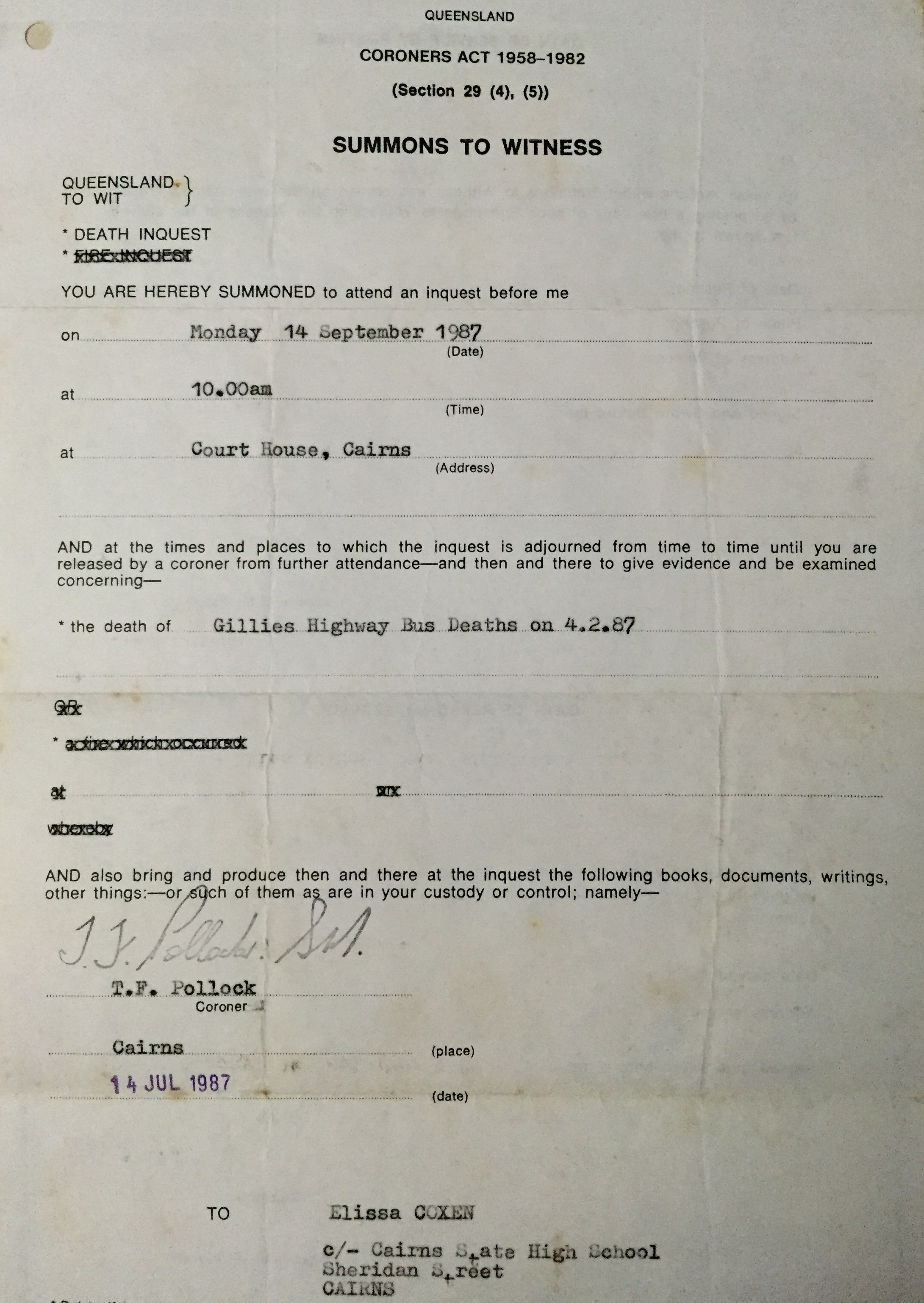 I received my summons to appear in court for the bus crash inquest on 24 July.
